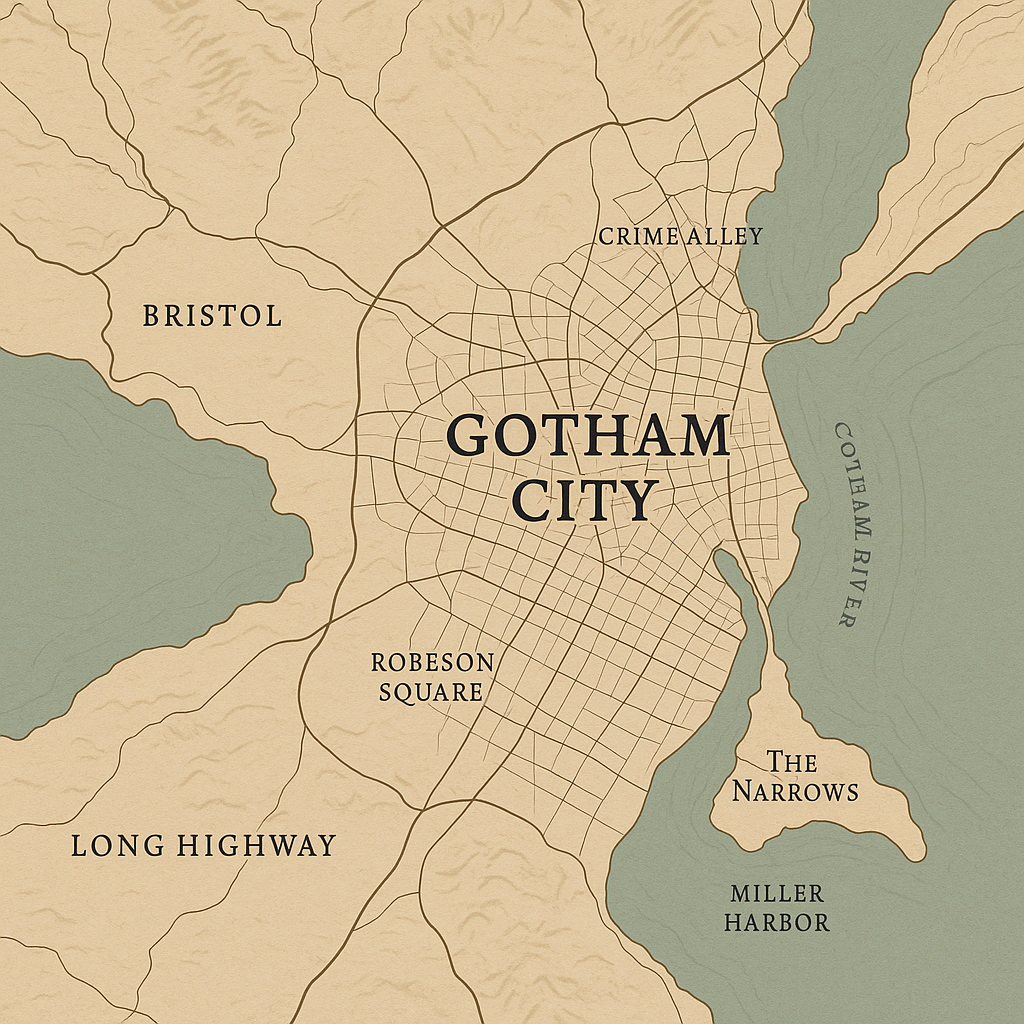 Fondée au début du 17e siècle par des colons venus d’Europe, Gotham était à l’origine un port prospère niché entre fleuve et collines. Mais derrière ses façades néogothiques et ses gratte-ciel imposants, la ville a vu naître autant de légendes que de cicatrices. Berceau d’industries flamboyantes, d’architectes visionnaires et de familles influentes comme les Wayne, Gotham a grandi au rythme du progrès… et du crime. Chaque quartier a son âme, chaque ruelle une histoire. Ville de contrastes, de mystères et de résistance, Gotham attire les curieux, les rêveurs, les intrépides — ceux qui savent que parfois, la vraie beauté se cache dans l’obscurité.